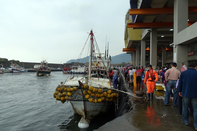 | 漁船靠岸卸貨,海巡人員在旁巡視 |